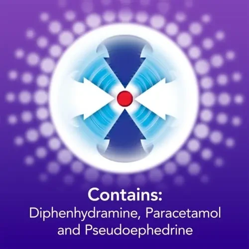 Please read the enclosed leaflet carefully before use. Contains paracetamol and diphenhydramine. Do not take with any medications containing any of these products, such as other cough and cold medicines. Contains Pseudoephedrine, which carries the risk of abuse due to tolerance and can result in overdose. Ask a doctor before use, if you suffer from conditions such as a chronic or persistent cough, asthma, acute or chronic kidney problems, or other conditions. Prolonged use except on the doctor's advice may be harmful. This product should be used only when clearly necessary. Do not exceed the stated dose. Immediate medical advice should be sought in the event of an overdose, even if you feel well. May cause drowsiness. If affected, do not drive or operate machinery. Avoid alcoholic drinks. Do not use this product to sedate a child. As with all medicines, if you are pregnant or taking any other medicine, consult your doctor or pharmacist before taking this product. If symptoms persist consult your doctor. Do not store above 25°C. Store in the original packaging and keep container in the outer carton. Keep out of the sight and reach of children.