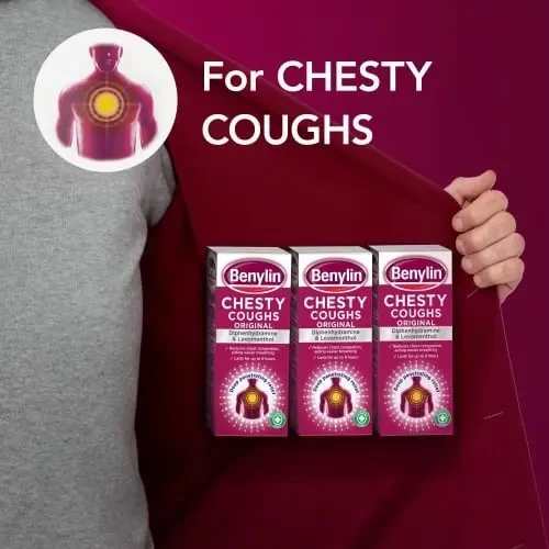 BENYLIN® Chesty Coughs Non-Drowsy works deep down in the chest to help loosen phlegm, so that when you cough you can actually cough some of the phlegm up. This helps clear bronchial congestion.