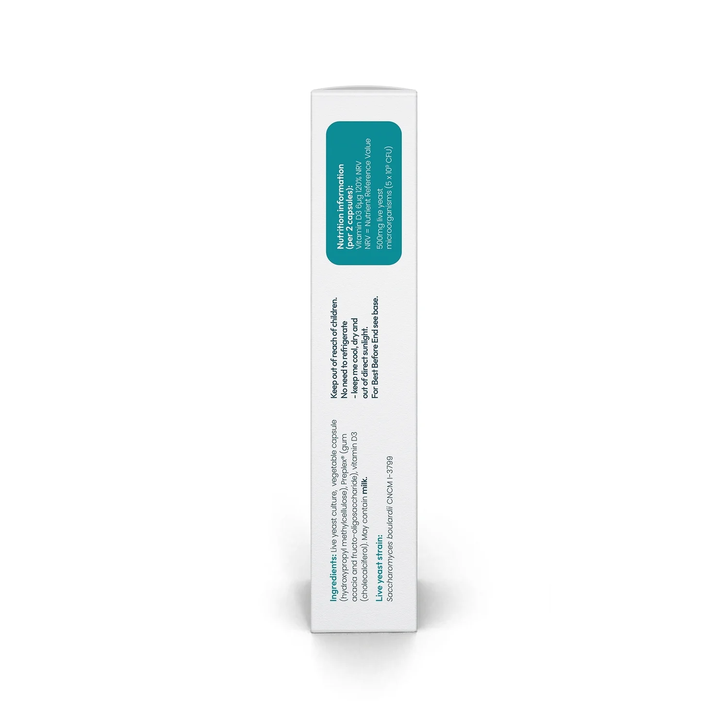 Live yeast culture, fuctooligosaccharide (FOS) and gum acacia, vitamin D3 (cholecalciferol), vegetable capsule (hydroxypropyl methylcellulose).