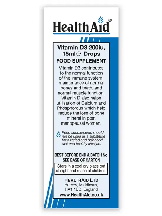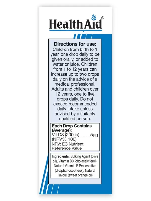 Certain health problems such as a weak immune system may be assisted by Vitamin D. Supplementation with Vitamin D alongside a healthy diet can contribute to the normal absorption and utilisation of Calcium and Phosphorus (which contribute to normal bones and normal teeth). Vitamin D is also used within the body for the normal function of the immune system. Vitamin D also contributes to normal blood Calcium levels and has a role in cell division. HealthAid Vitamin D 200iu Drops are perfect for children and those who are unable to swallow tablets."