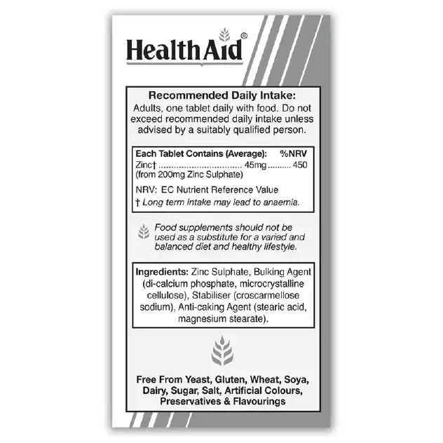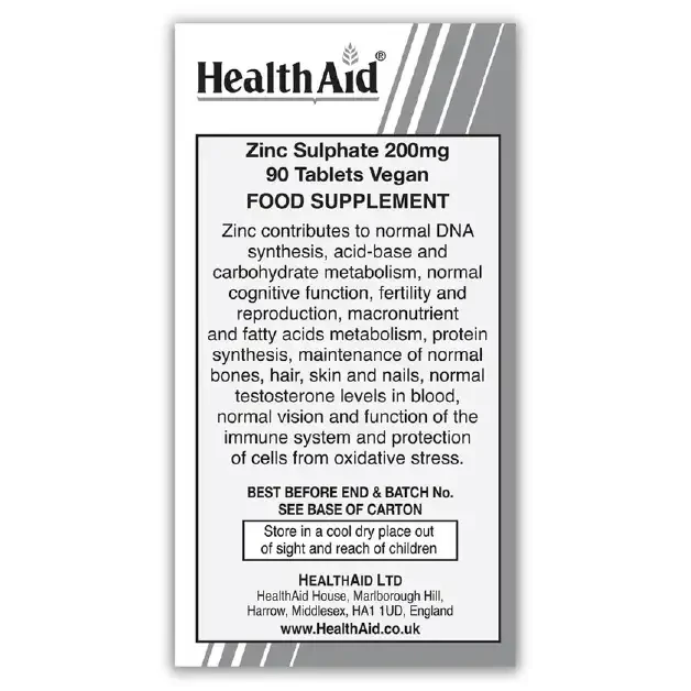 Elemental Zinc is well absorbed by the body making zinc sulphate a suitable supplement for supporting a healthy lifestyle. The high bioavailability of elemental Zinc in HealthAid®’s carefully formulated Zinc sulphate tablets provide the essential trace element Zinc to the body for numerous bodily processes.
