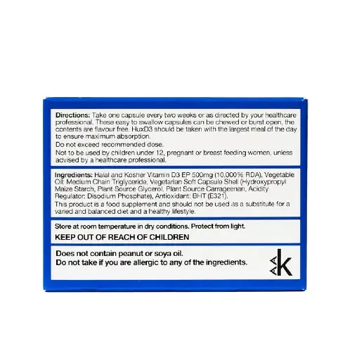 HuxD3 is a high strength vitamin D (colecalciferol or D3) food supplement. It is free from common allergens and is compliant with Halal diet requirements. The ingredients are suitable for vegetarian diets and the vitamin D is sourced from the wool of living sheep only.