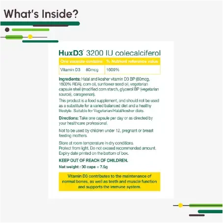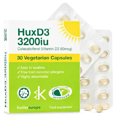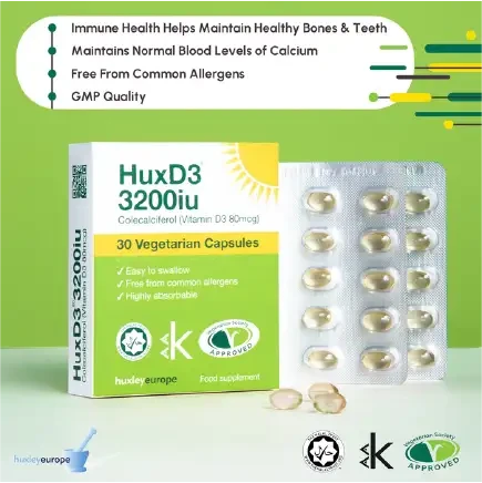 HuxD3 is a high strength vitamin D (colecalciferol or D3) food supplement. It is free from common allergens and is compliant with Halal diet requirements. The ingredients are suitable for vegetarian diets and the vitamin D is sourced from the wool .