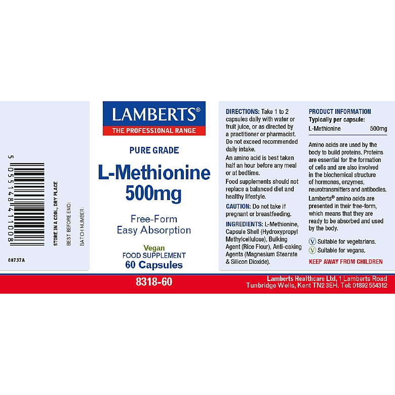 Presented in its free-form for maximum absorption Each capsule provides a full 500mg of L-Methionine Manufactured in the UK to pharmaceutical GMP standards Methionine is a sulphur containing amino acid and along with cysteine they represent the main source of sulphur in our diets Suitable for vegetarians Lamberts® L-Methionine is presented in its free-form for maximum absorption. Each capsule provides a full 500mg of L-Methionine and are manufactured in the UK to pharmaceutical GMP standards. Methionine is termed an 'essential amino acid' as our bodies cannot make it and so we must obtain it from the food we eat. Fruit and vegetables are generally low in methionine but high levels of methionine can be found in eggs, nuts, fish, and meats. Methionine is a sulphur containing amino acid and along with cysteine they represent the main source of sulphur in our diets.