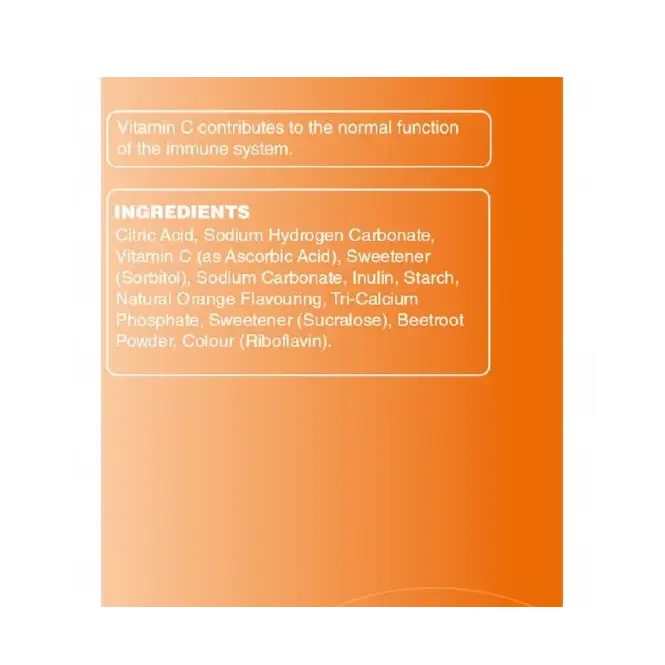 Citric Acid, Vitamin C (as Ascorbic Acid), Sodium Bicarbonate, Sweetener (Sorbitol), Sodium Carbonate, Inulin, Potato Starch, Natural Orange Flavouring, Tri-Calcium Phosphate, Sweetener (Sucralose), Maltodextrin, Beetroot Powder, Colour (Riboflavin)