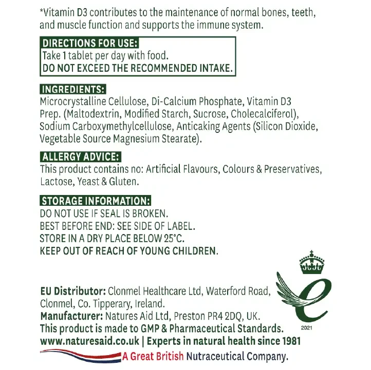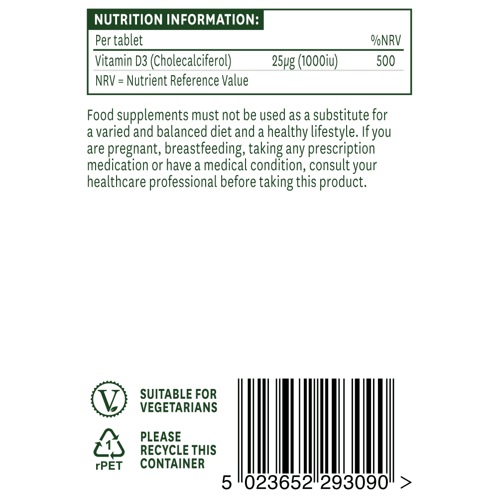Natures Aid Vitamin D3 1000iu is a daily Vitamin D supplement, providing 1000iu of Vitamin D3 – the most active form of this nutrient. This strength of Vitamin D is safe for longer term use if required. For your peace of mind Natures Aid Vitamin D3 1000iu is gluten, lactose, yeast, soya and dairy free. It is also suitable for vegetarians. If you are looking for a vegan friendly Vitamin D supplement, why not check out our Vegan Vitamin D3.