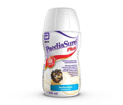 PaediaSure Plus is suitable for the dietary management of children weighing 8 - 30 kg with, or at risk of developing, disease-related malnutrition. PaediaSure Plus provides 1.5 kcal/ml and is available both as a 500 ml ready-to-hang tube feed and as a 200 ml oral nutritional supplement (ONS). PaediaSure Plus ONS is ready-to-drink and available in four flavours: banana, strawberry, unflavoured and vanilla.