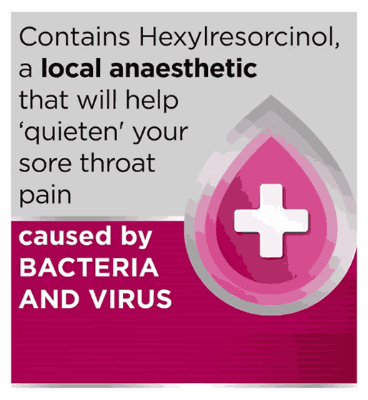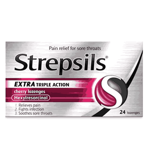 Strepsils Extra Triple Action Cherry Lozenges contains an active ingredient (Hexylresorcinol) for use in throat medications. It is used for the symptomatic relief of sore throat and its associated pain.