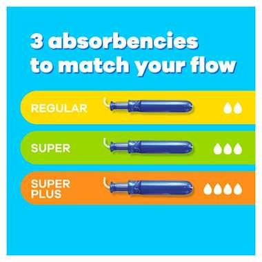 When using tampons, it's important to choose the lowest absorbency necessary for your menstrual flow. And because the amount of flow varies from day to day, it's likely that you will need to use different absorbencies on different days of your period. Selecting the right absorbency comes with experience, but as a guide, if a tampon absorbs as much as it can and has to be changed before 4 hours, then you may want to try a higher absorbency. On the other hand, if you remove a tampon and after 4-6 hours white fibre is still showing, you should choose a lower absorbency. "