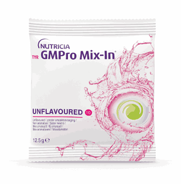 TYR GMPro Mix-In is a Food for Special Medical Purposes for use under medical supervision. TYR GMPro Mix-In is an unflavoured, nutritionally incomplete, low phenylalanine* and low tyrosine*, powdered protein source containing glycomacropeptide (GMP), with essential and non-essential amino acids, a small amount of carbohydrate and some minerals. TYR GMPro Mix-In is available in 30 x 12.5g sachets. *TYR GMPro Mix-In contains 18.0mg of phenylalanine and 3.5mg of tyrosine per 12.5g sachet. This should be taken into consideration as part of the patient’s overall dietary intake. Protein substitutes based on GMP are a natural source of phenylalanine and tyrosine.