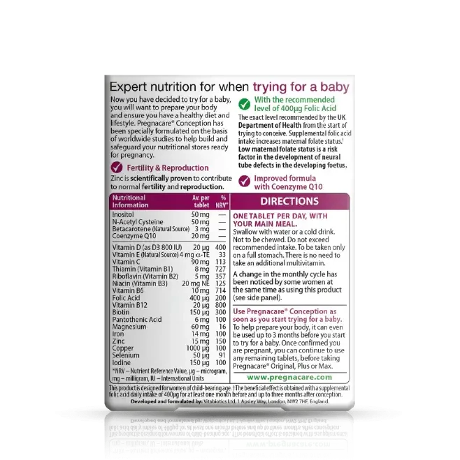 Pregnacare Conception provides a carefully balanced comprehensive formulation of micronutrients including the specific nutrients Inositol, Coenzyme Q10 , N-acetyl Cysteine and selenium. The formula also includes vitamin B12 and folic acid at 400µg, the exact level recommended by the Department of Health.