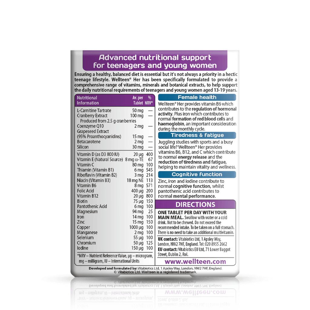 The Wellteen Her Plus tablets include zinc, iron and iodine which contribute to normal cognitive function, whilst pantothenic acid contributes to normal mental performance to help support concentration levels when studying. Iron also contributes to normal formation of red blood cells & haemoglobin and contributes to normal oxygen transport in the body to support cells and organs.