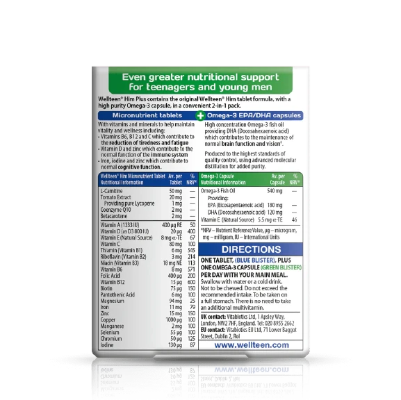 Today's young adults have more to live up to than ever before, with busy social lives, late nights and early mornings, studying and sports to juggle. Ensuring a healthy, balanced diet is essential but it's not always a priority in a hectic teenage lifestyle. Wellteen Him Plus has been developed especially for teenagers and young men aged 13-19 years, it provides a comprehensive range of vitamins, minerals, Co-Q10, botanical extract Lycopene, plus a high purity Omega-3 capsule. Omega 3 provides DHA which helps to maintain normal brain function and vision. A beneficial effect is obtained with a daily intake of 250mg of DHA.