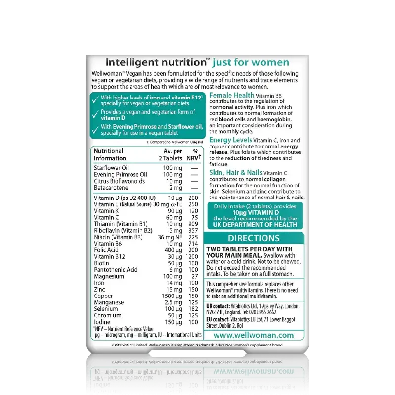 Wellwoman Vegan has been specially developed to provide higher levels of iron and vitamin B12 (when compared to Wellwoman Original).