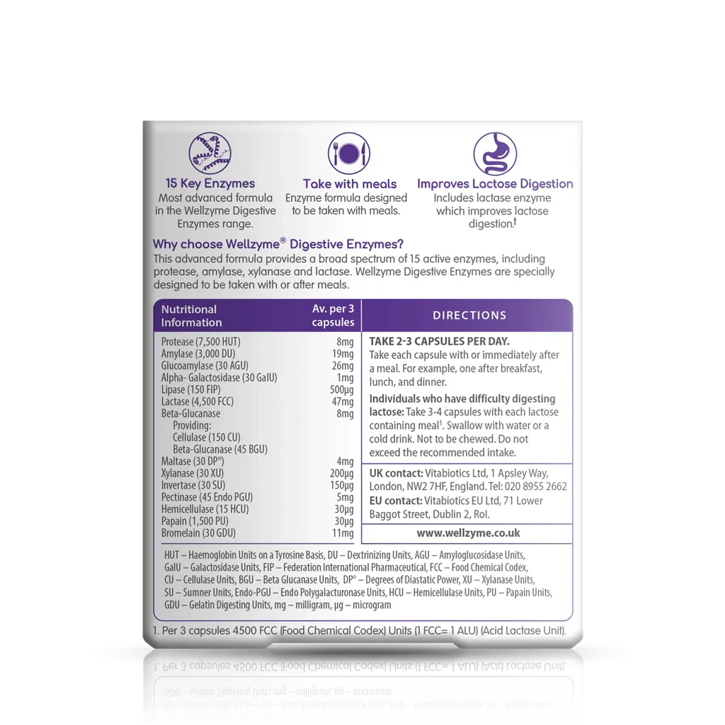 Wellzyme Digestive Enzymes provides the exact recommended daily level of Lactase 4500 FCC (per 3 capsules) which improves lactose digestion.